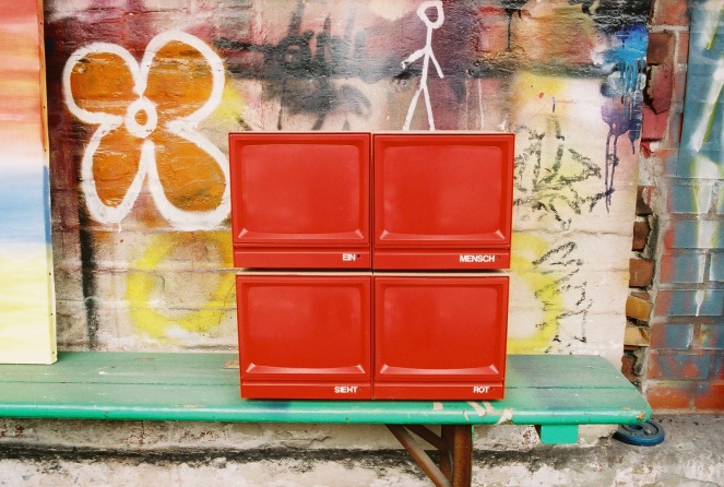 Incl. Vielen politischen Anspielungen wie z.B. Fluchttür, Flüchtende mit Ballon und der natrürlich im Westen untergehenden Sonne. Mit Feuersäulen etc.