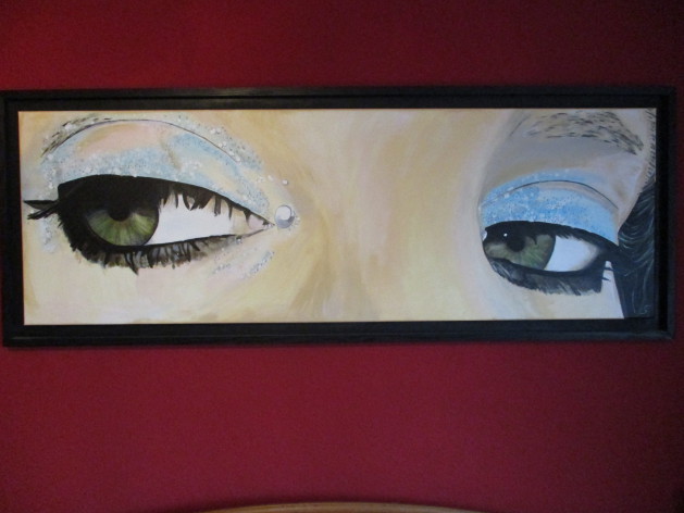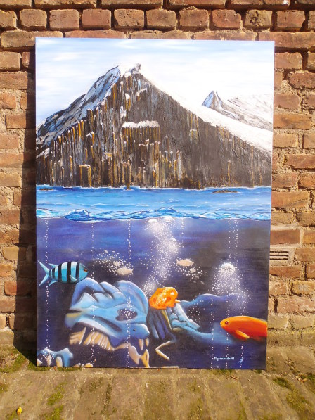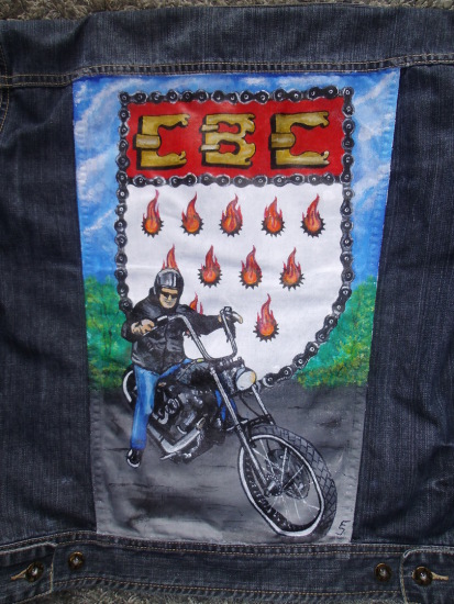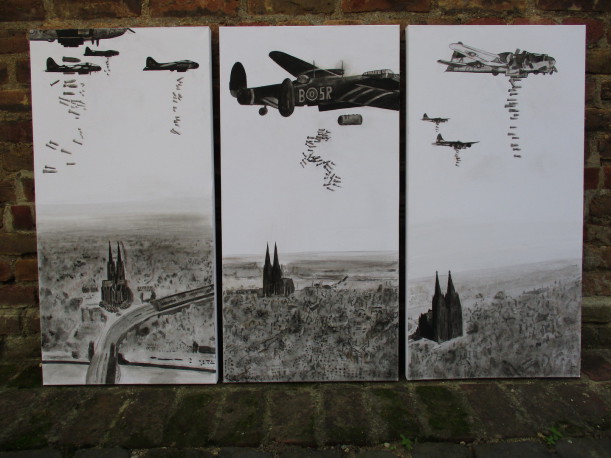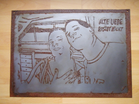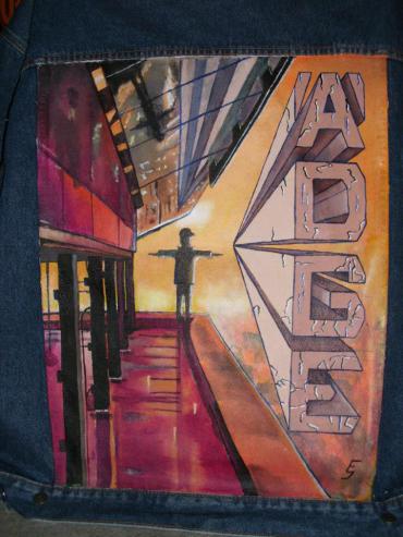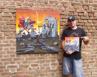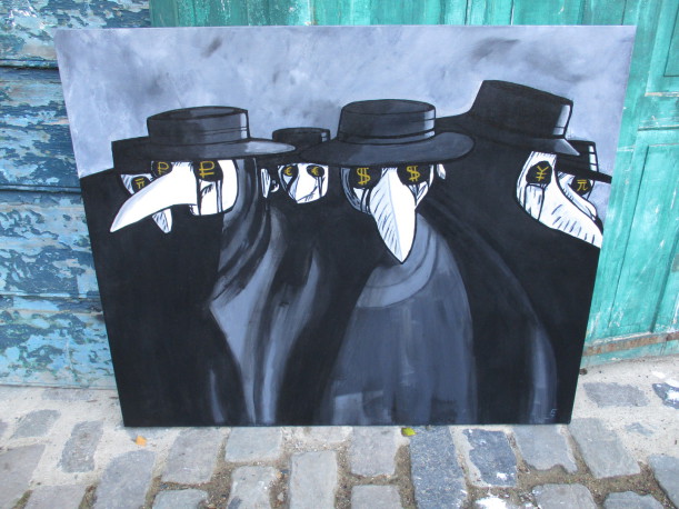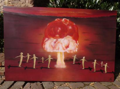 Mit vielen spitzen politischen Seitenhieben im Hintergrund, wie z.B. Twintowers, 500 € Schein Klopapier etc. 200cm X 70cm.