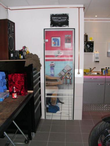 Motiv zeigt die Illusion eine Glastür, bei der es so aussieht als Blicke man in eine besetzte Toilette, wo der Besitzer von CBC