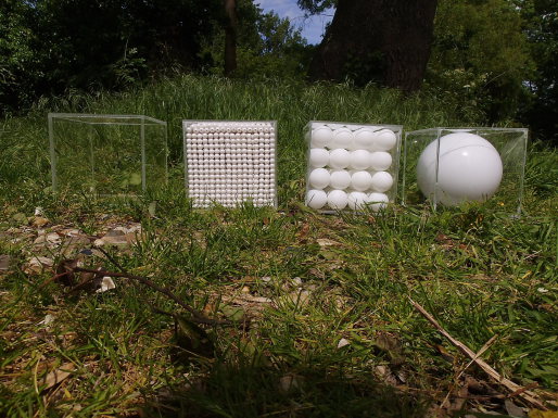 Skulptur aus vier Plexiglaswürfeln mit verschiedenen Kugeln gefüllt.